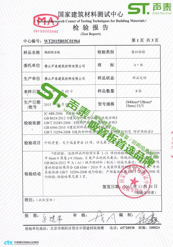聲泰陶鋁復合穿孔吸音板廣泛用于大型的會議場所、體育場館、歌劇場館、演播室、報告廳、多功能廳等建筑!該產品具有防火A2級難燃性能、環保E1級、吸音效果好、裝飾效果杠杠滴!客戶用了都叫好。最主要的一點就是也是很多工地要求提供的陶鋁穿孔吸聲板平整度的檢測報告!以下附圖是我司權威機構檢測的平整度檢測報告!目前我司跟萬達所合作的【南昌瓷都劇院】【合肥萬達劇院】所采用的均是我司出品的陶鋁穿孔吸聲板..