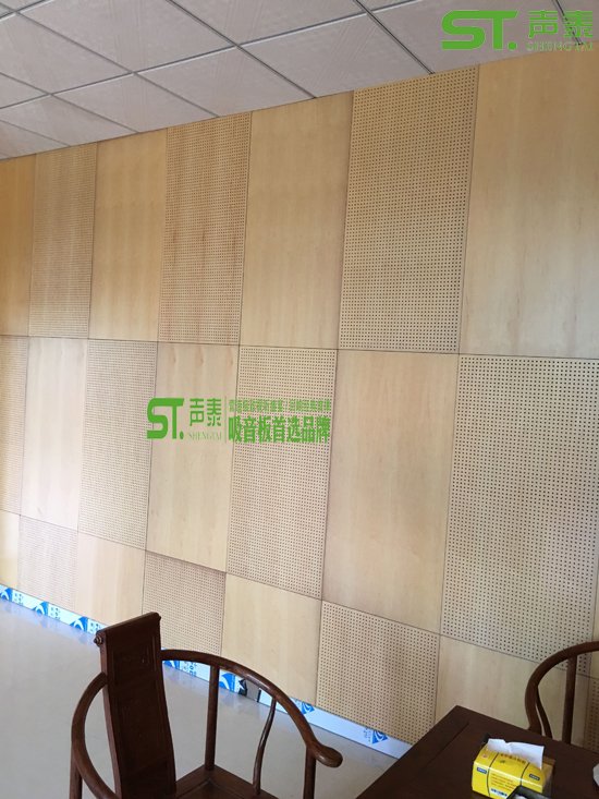 以下是我司承接某公司辦公洽談室的吸音裝修,墻面所采用的是木飾面孔木吸音板、木飾面裝飾板、天花所采用的是礦棉吸音板,該辦公洽談室沒做吸音之前混響時間高達8秒,經過我司聲學裝飾處理之后該室內混響時間2秒左右!接下來展示一下木紋飾面吸音板與裝飾板完美搭配的安裝效果圖!